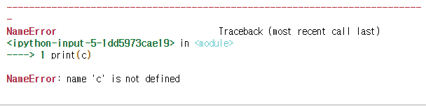 a와 b의 변수를 선언하였는데요. 여기서 c라는 변수를 출력하면 어떻게 될까요?